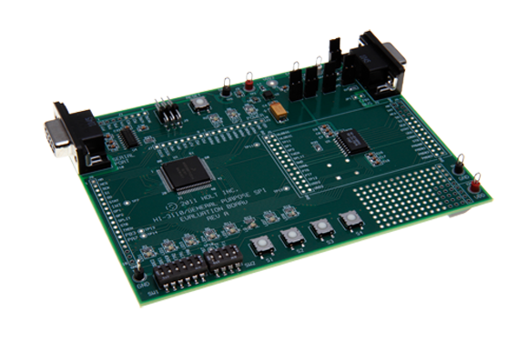 The Holt HI-3110 ARINC 825 CAN BUS Controller Evaluation Board can be used to evaluate some of the features of the HI-3110 CAN Controller IC with integrated transceiver. A Freescale MC9S12XDT512 microcontroller with 512K flash and 20K RAM communicates with the HI-3110 through the SPI interface. The board includes switches and LEDs to help navigate the operating modes and confirm data and status information. A Serial UART port is provided to allow debug and data messages to be sent to a PC using any terminal program such as Hyper-terminal.