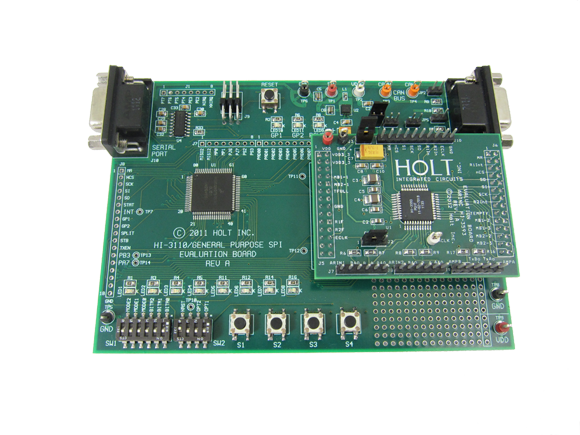 The main board “General Purpose SPI Evaluation Board” includes switches, pushbutton switches and LEDs to help navigate the operating modes and confirm data and status information. A Freescale MC9S12XDT512 microcontroller on the main board communicates with the HI-35930 through the SPI interface. A Serial UART port is provided which enables viewing messages and status information or entering of optional commands using any terminal program such as Hyper-Terminal. The HI-35930 Evaluation Board is a daughter card that plugs on to the General Purpose SPI board via two 26 pin connectors.