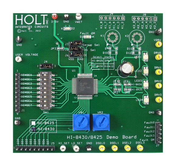 The HI-8425 Evaluation Board allows the user to evaluate the HI-8425 avionics discrete-to-digital sensing IC. The HI-8425 includes eight sensor input channels and four low-side output drivers. The eight input channels are configurable for either Ground/Open or Supply/Open sensing depending on the state of the SNSE_SEL pin. The board features jumpers, DIP switches, test points, LED’s and two potentiometers to facilitate IC testing and evaluation.