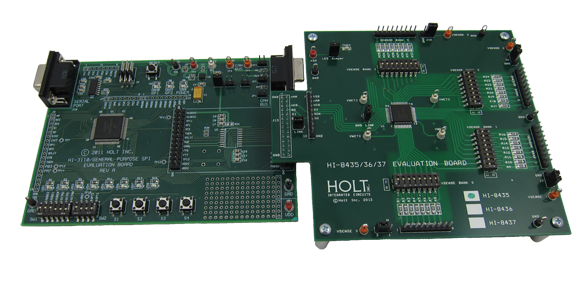 The Holt HI-8435 Evaluation Board demonstrates the features of the HI-8435, a 32 channel Ground/Open or 28V/Open discrete-to-digital sensor IC with SPI interface. The board and the HI-8435 run from a single 3.3V supply voltage.  Sensor input thresholds are programmable from 2V to 21V. The EVM (Evaluation Module) plugs into a Holt General Purpose SPI Evaluation Board, which is based on a Freescale MC9S12XDT512 microcontroller motherboard. The motherboard MCU communicates with the HI-8435 via the SPI interface. Switches and LEDs help navigate the operating modes and confirm data and status information. A Serial UART output from the MCU provides debug and data messages to be sent to a PC using any terminal emulation program such as HyperTerminal.