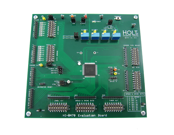 The Holt HI-8470 Evaluation Board demonstrates features of the HI-8470 16 channel discrete-to-digital sensor with ARINC 429 transmitter. The board and the HI-8470 can be run from a single 3.3V +/-5% supply voltage. The device has preset internal sensor thresholds; external thresholds can also be set with board-mounted potentiometers. The HI-8470 and Evaluation Board require no software for control; all functions are set by hardware switches. DIP switches configure the device and data inputs.