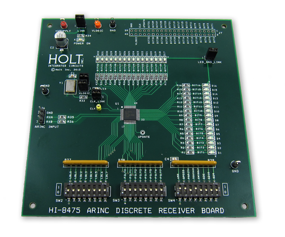 The Holt HI-8475 Evaluation Board demonstrates features of the HI-8475 ARINC 429 receiver IC. This device will decode 32 bit ARINC 429 words into parallel or serial format without the use of any software. The board and the HI-8475 can be run from a single 3.3V+/- 5% supply voltage. The HI-8475 and EVM (Evaluation Module) requires no software for control; all functions are set by hardware switches. Data can be filtered according to the label content of the ARINC word, using the LLA and FILT input setting and set with DIP switches. Other DIP switches configure the device speed, test modes etc.