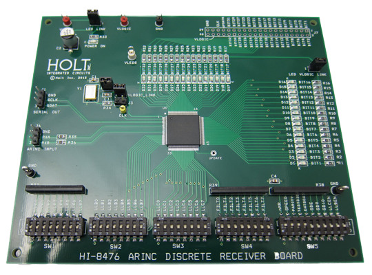 The Holt HI-8476 Evaluation Board demonstrates features of the HI-8476 ARINC 429 receiver IC. This device will decode 32 bit ARINC 429 words into parallel or serial format without the use of any software. The board and the HI-8476 can be run from a single 3.3V+/- 5% supply voltage. The HI-8476 and EVM (Evaluation Module) requires no software for control; all functions are set by hardware switches. Data can be filtered according to the label content of the ARINC word, using the LLA, LLB, LLC and FILT input setting and set with DIP switches. Other DIP switches configure the device speed, test modes etc.