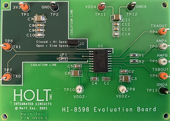 The HI-8598 is powered from two 3.3V power supplies, one for the logic side and one for the line driver side.Test signals can be applied and monitored using the test points.